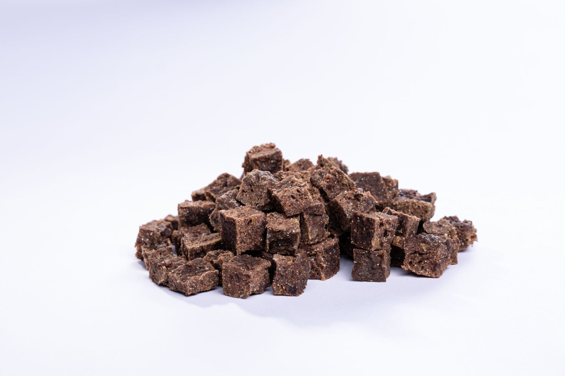Hirschmuskelfleisch mit Bio-Karotte und Bio-Ei ergeben Belohnungen, die das Hundeherz höher schlagen lassen.