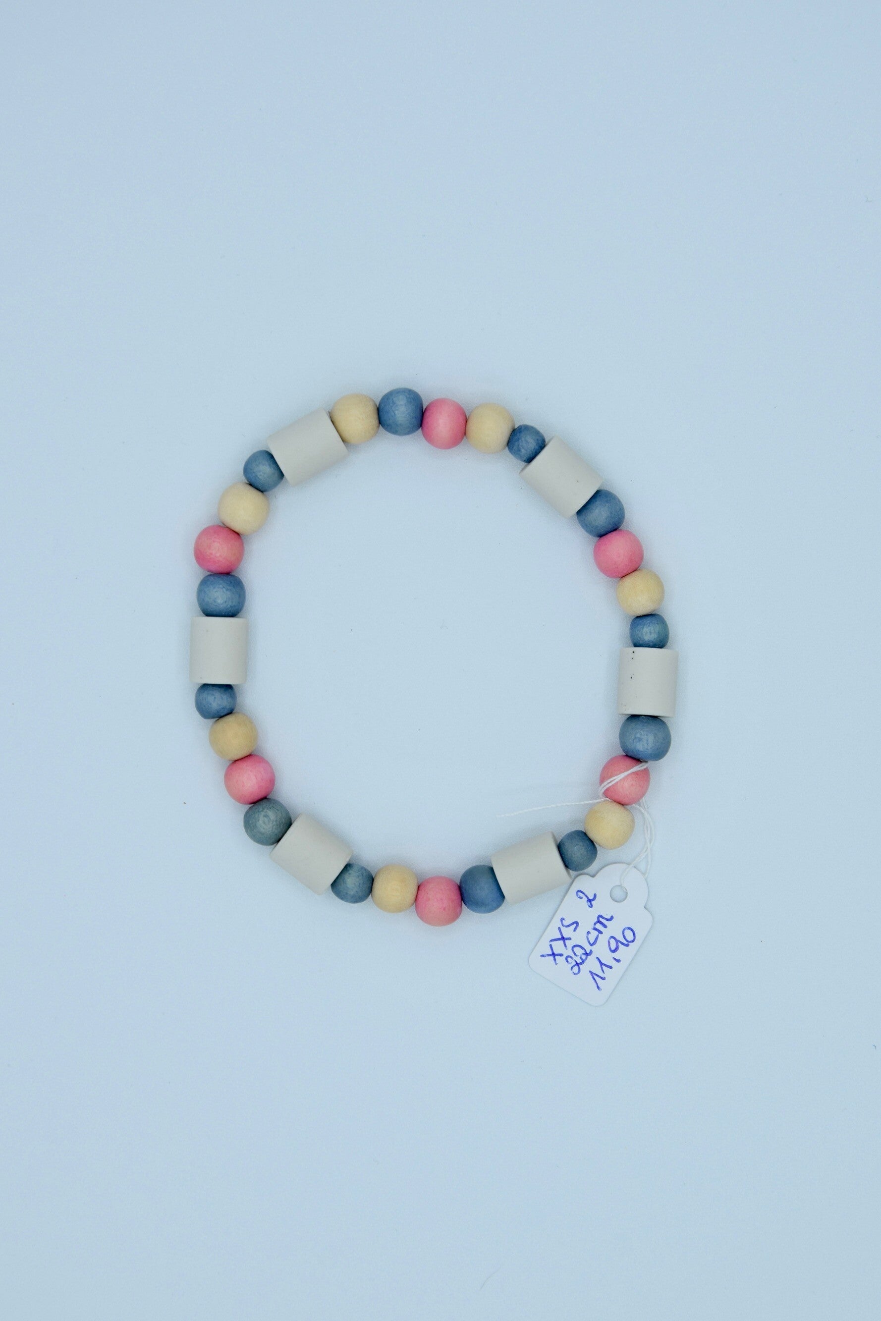 Die Halskette besteht aus 6 EM-Keramik Pipes und Holzperlen (blau-rosa-beige)