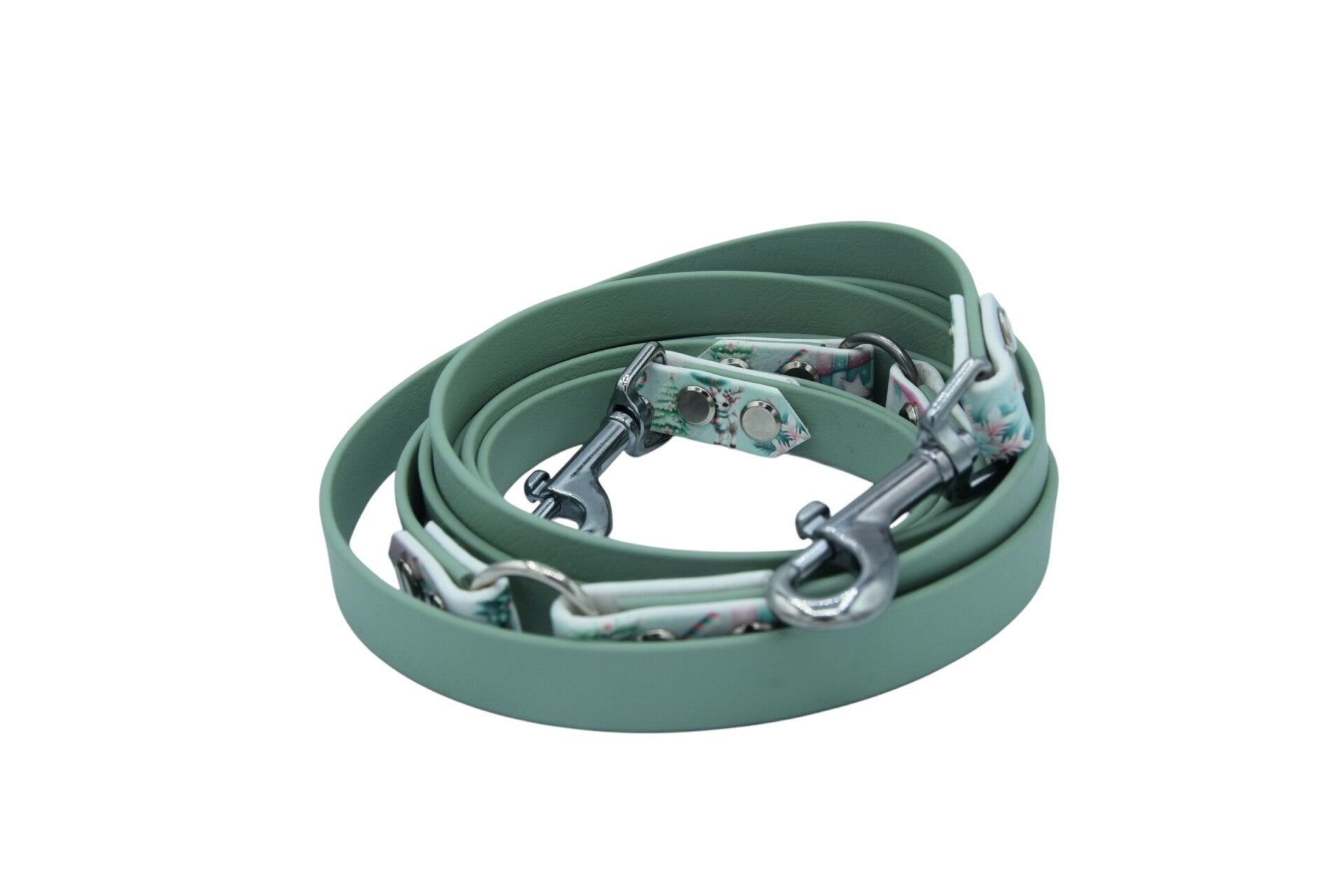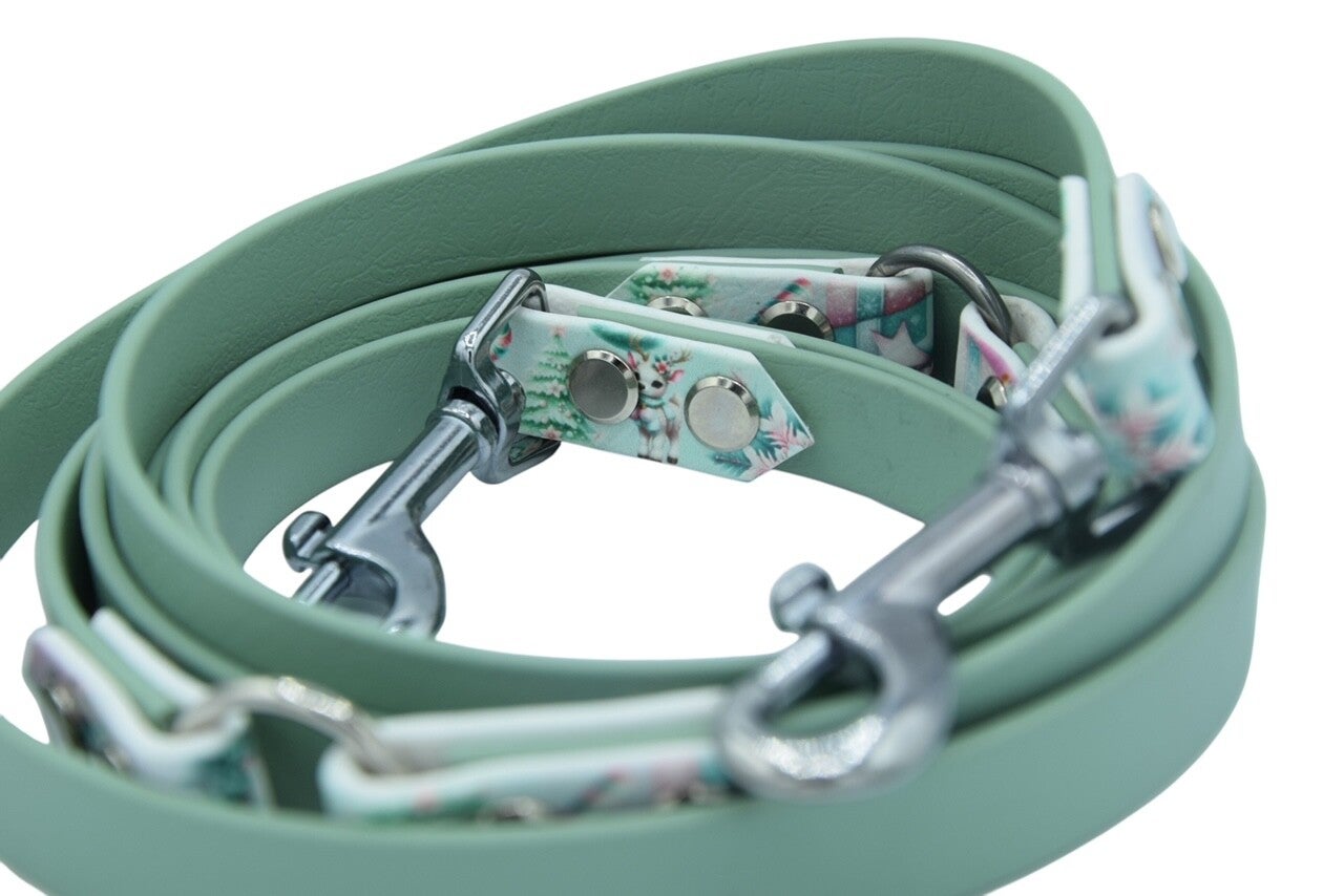 Mintfarbene Biothane mit bedruckten Biothane-Applikationen die super zum "Winterwonderland"-Halsband passen