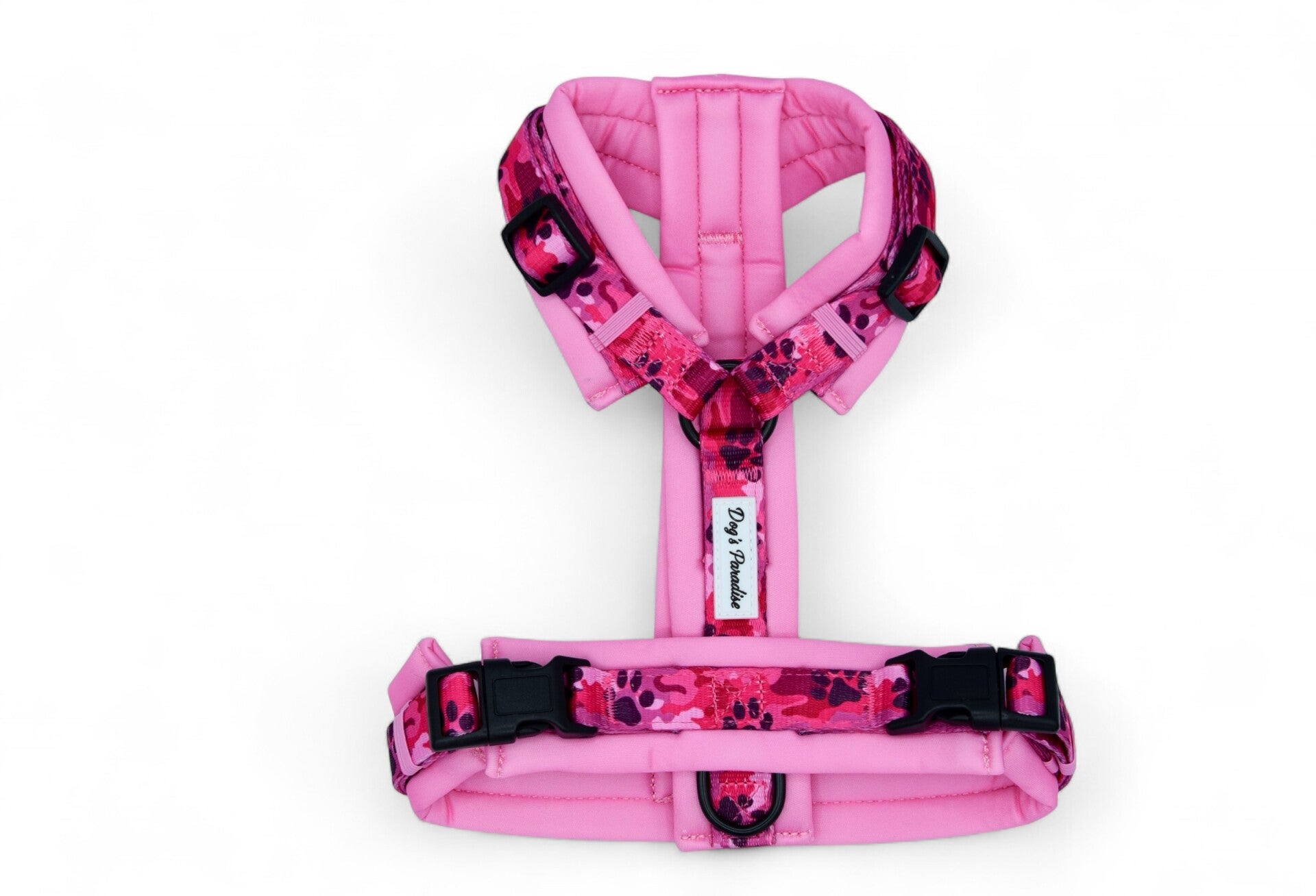 Ein wunderschönes Brustgeschirr in der Farbe pink mit dem Design von Camouflage und Pfoten. Die weiche Neoprenpolsterung auf der Innenseite ist in rosa gehalten. Die Beschläge sind in schwarz gehalten.